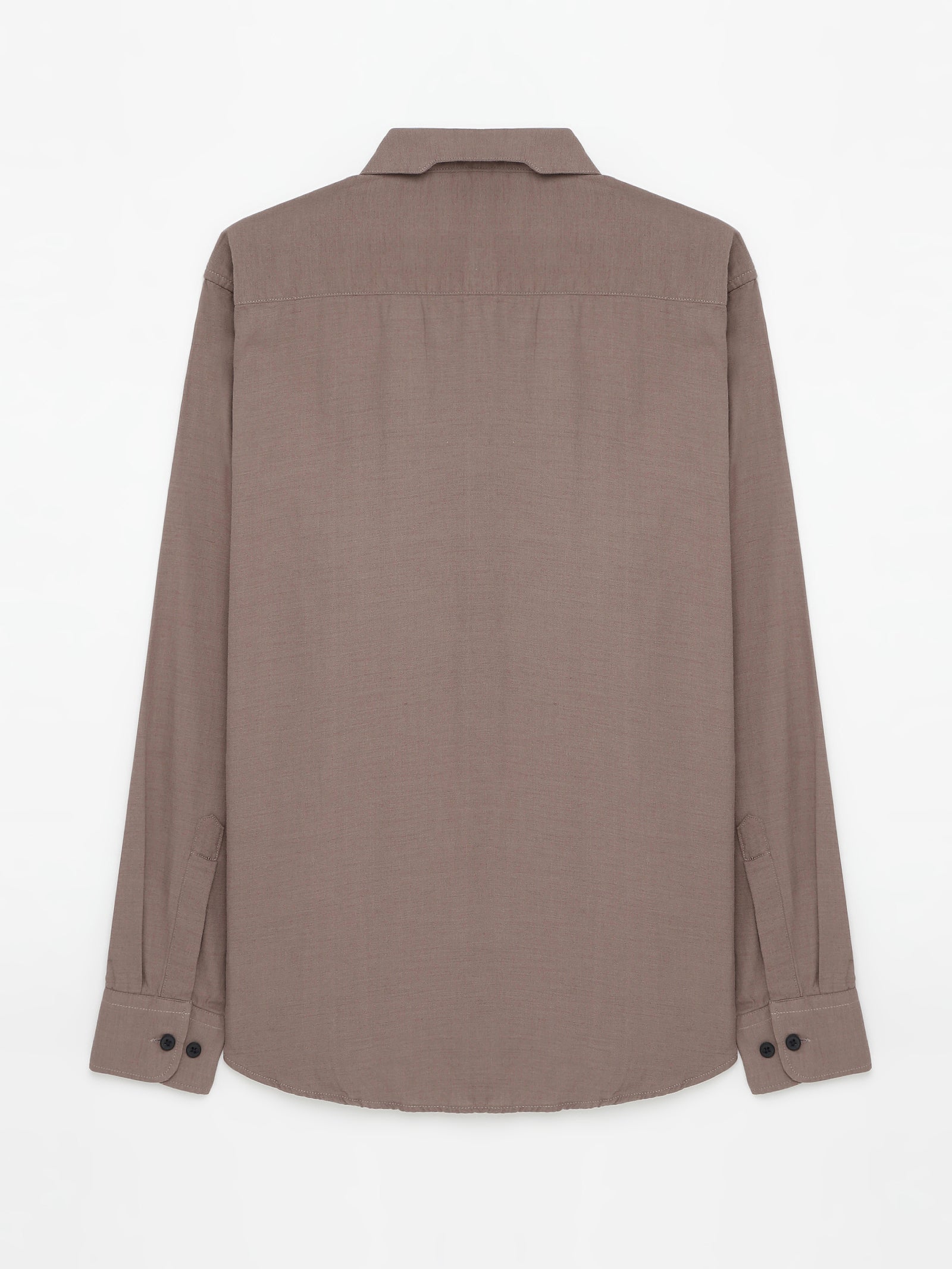 A shirt that lives between dusk and dawn — soft, structured, and silent. The muted taupe carries the warmth of night fading and the calm of light returning.